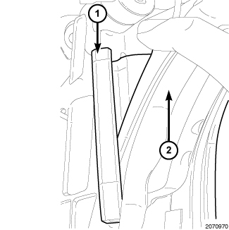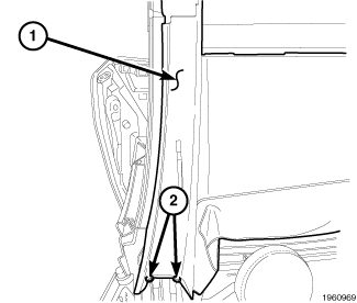 2. Using a trim stick or equivalent, gently remove both push pins (2) in the bottom of the right and left center rail trim (1).