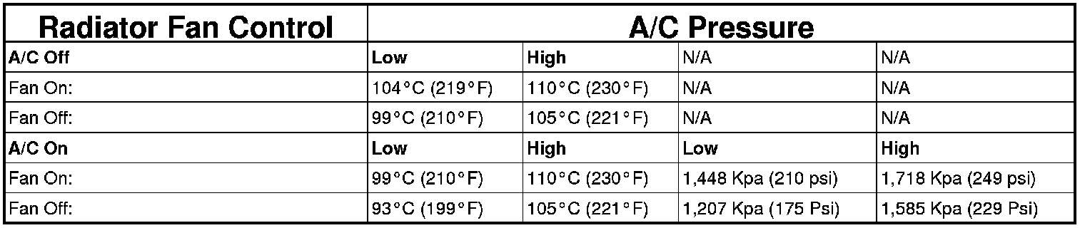 Fan control is accomplished three ways. The fan runs when the air conditioning pressure reaches a set pressure, refer to RADIATOR FAN OPERATION chart. In addition to this control, the fan is turned on by the temperature of the coolant which is sensed by the coolant temperature sensor which sends the message to the Powertrain Control Module (PCM). The PCM turns on the fan through a fan relay. On models equipped with automatic transmission, a transmission fluid thermistor may have some influences on fan operation. See Wiring Diagrams for circuity and diagnostics provided.