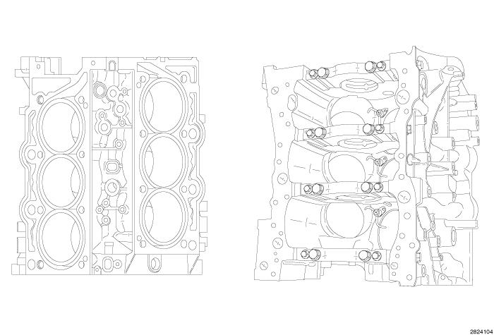 The cylinder block is a 60 degree high-pressure die cast aluminum design with cast steel cylinder liners. The leading side of the block is on the right side and houses cylinders 1, 3 and 5. The cylinder block is an open deck design with cut slots between each cylinder. Two knock sensors are located in the block valley. The cylinder block has three sets of piston cooling jets which are attached to the main oil gallery. The four powdered metal main bearing caps are a cross-bolted design and have directional arrows molded into the caps. The number 2 main bearing is the location for the two piece upper half thrust bearings. The thrust bearings are installed with the oil groves facing outward. The main bearing caps are a 6-bolt design and cross-bolted for improved lower end strength. There are three oil drain back drillings located on each of the cylinder banks.