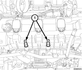 5. Apply a 2 to 3 mm wide bead of Mopar(R) Threebond Engine RTV Sealant (1) to the two engine timing cover to cylinder head T-joints as shown.