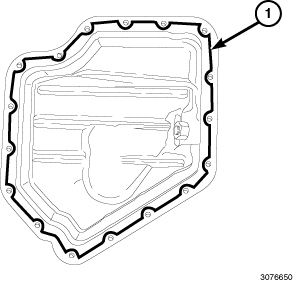 2. Apply a 2 to 3 mm wide bead of Mopar(R) Threebond Engine RTV Sealant (1) to the lower oil pan as shown.