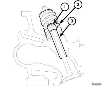 The valve stem oil seals (1) are made of elastomer over-molded steel in a non-integrated type guide mounted configuration. The seal is not held in place by the valve spring (2). The valve stem seals are not reusable if removed from the valve guides (3), they must be replaced. Always coat the valve seals with clean engine oil before installing the valves.