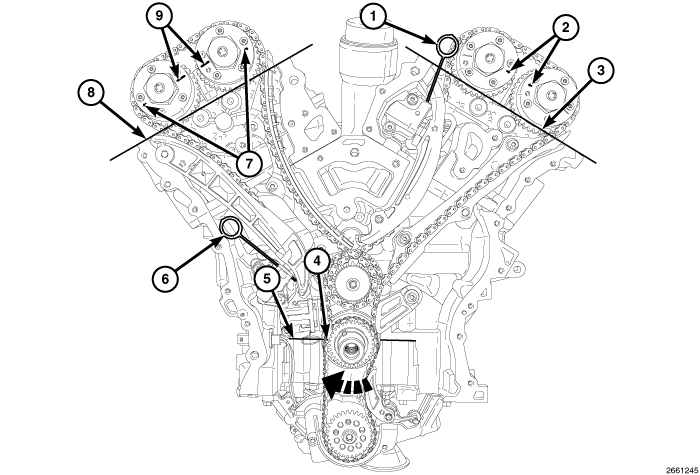37. While maintaining this alignment, verify that the ARROWS (2) on the left side cam phasers point toward each other and are parallel to the cylinder head cover mounting surface (3) and that the right side cam phaser ARROWS (7) point away from each other and the SCRIBE LINES (9) are parallel to the cylinder head cover mounting surface (8).