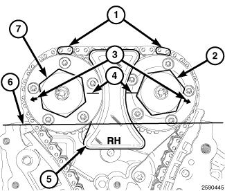 26. Press the right side exhaust cam phaser onto the exhaust camshaft. Install and hand tighten the oil control valve (7).