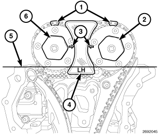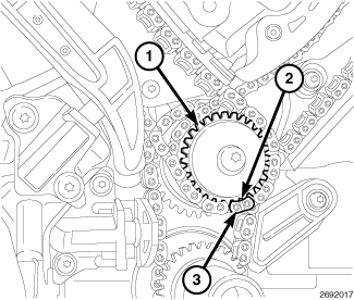 21. Drape the left side cam chain over the left side intake cam phaser and onto the idler sprocket (1) so that the arrow (3) is aligned with the plated link (2) on the cam chain.