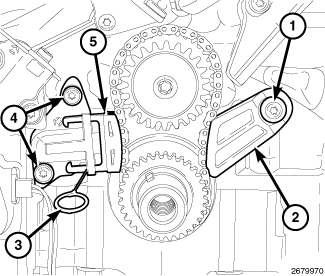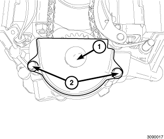 33. Install the oil pump chain tensioner (1). Insure that the spring (3) is positioned above the dowel pin (2).