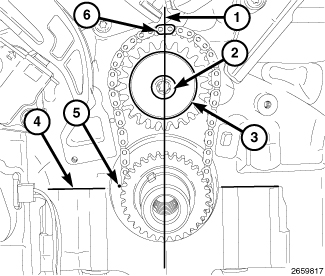15. While maintaining this alignment, lubricate the idler sprocket bushing with clean engine oil and install the sprockets and timing chain on the engine. To verify that the timing is still correct, the timing chain plated link (6) should be located at 12:00 (1) when the dimple (5) on the crankshaft is aligned with the block/bearing cap junction (4).
