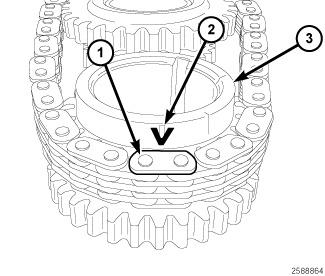27. Drape the right side cam chain over the right side exhaust cam phaser and onto the idler sprocket (1) so that the dimple (2) is aligned with the plated link (3) on the cam chain.