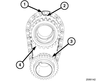 14. While maintaining this alignment, invert the crankshaft sprocket and timing chain and place the idler sprocket (4) into the timing chain so that the dimple (2) is aligned with the plated link (1) on the timing chain.