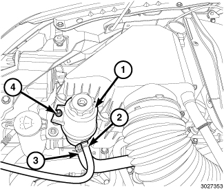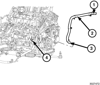 4. Remove the clamp (3) securing the supply hose (2) to the power steering pump (4) supply fitting, then slide the hose off the supply fitting and remove from vehicle.