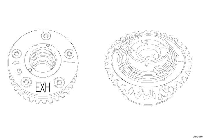 The 3.6L engine is equipped with Variable Valve Timing (VVT). This system adjusts the timing of all four camshafts independently using solenoids and oil control valves to direct oil pressure into the camshaft phaser assemblies. The camshaft phaser assembly advances and/or retards camshaft timing to improve engine performance, mid-range torque, idle quality, fuel economy, and reduce emissions. The four phasers are located on the front of the camshafts, behind the VVT solenoids, inside of the engine timing cover. The exhaust phasers are identified with EXH and the intake phasers are identified with INT. The exhaust phaser has a clockspring, the intake phaser does not. The camshaft sprockets are integrated with the camshaft phaser and are serviced as an assembly. Do not attempt to disassemble the phasers, they are not serviceable. Phasers are interchangeable between the right and left cylinder heads but should be installed in the same location as removed.