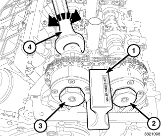 It may be necessary to rock the camshaft slightly (a few degrees) with a wrench (4) when installing the camshaft phaser lock.