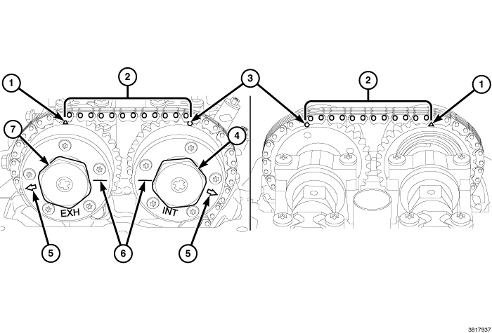 - There are twelve chain pins (2) BETWEEN the exhaust cam phaser triangle marking (1) and the intake cam phaser circle marking (3).