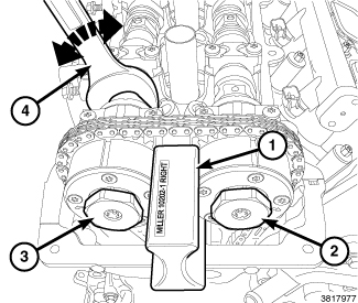 It may be necessary to rock the camshaft slightly (a few degrees) with a wrench (4) when installing the camshaft phaser lock.