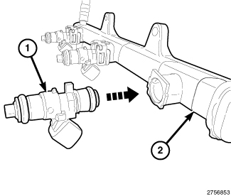 2. Install the fuel injectors (1) to the fuel rail (2).