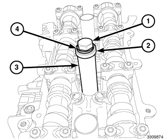 4. Position the spark plug tube (3) on the top half of Spark Plug Tube Installer (10255) (2) and assemble the tool on the cylinder head. Make sure there are two thrust washers (4) installed.