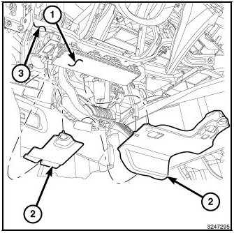 6. Reinstall the close out panels (2) under the driver side of the instrument panel lower reinforcement (3) and surrounding the KAB cover (1) and housing.