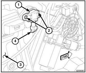 4. Remove the two screws (2) that secure the side impact sensor to the front door hardware module carrier panel (3).