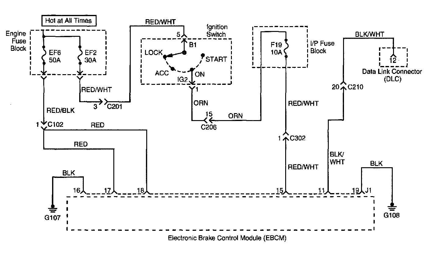 Battery voltage is supplied to the Electronic Brake Control Module (EBCM) through fuse F19 in the I/P fuse block, to terminal 15 of the EBCM connector. The voltage is present when the ignition switch is in the ON or START position.