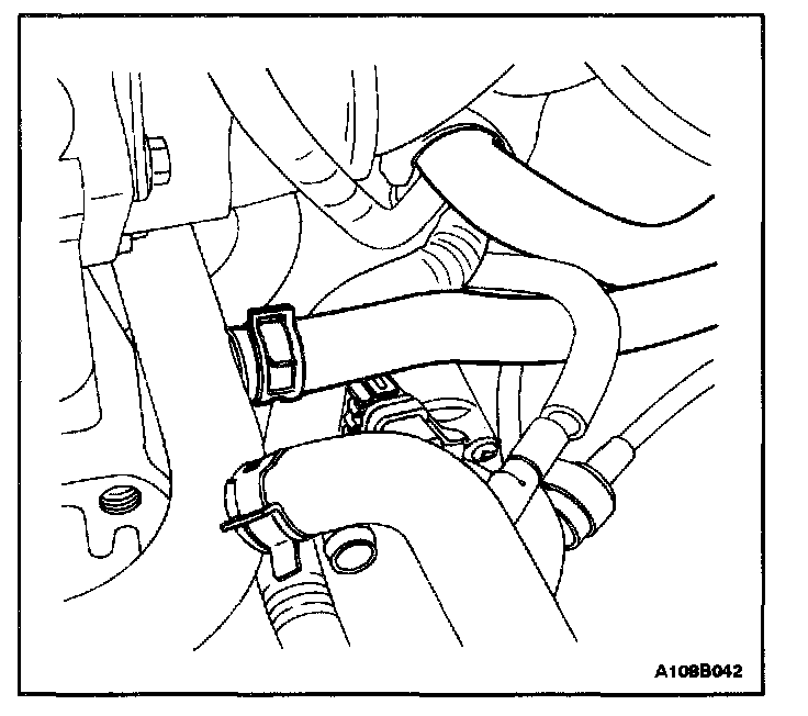 8. Compress the heater hose spring clamp at the connection below the intake manifold and slide the clamp rearward.