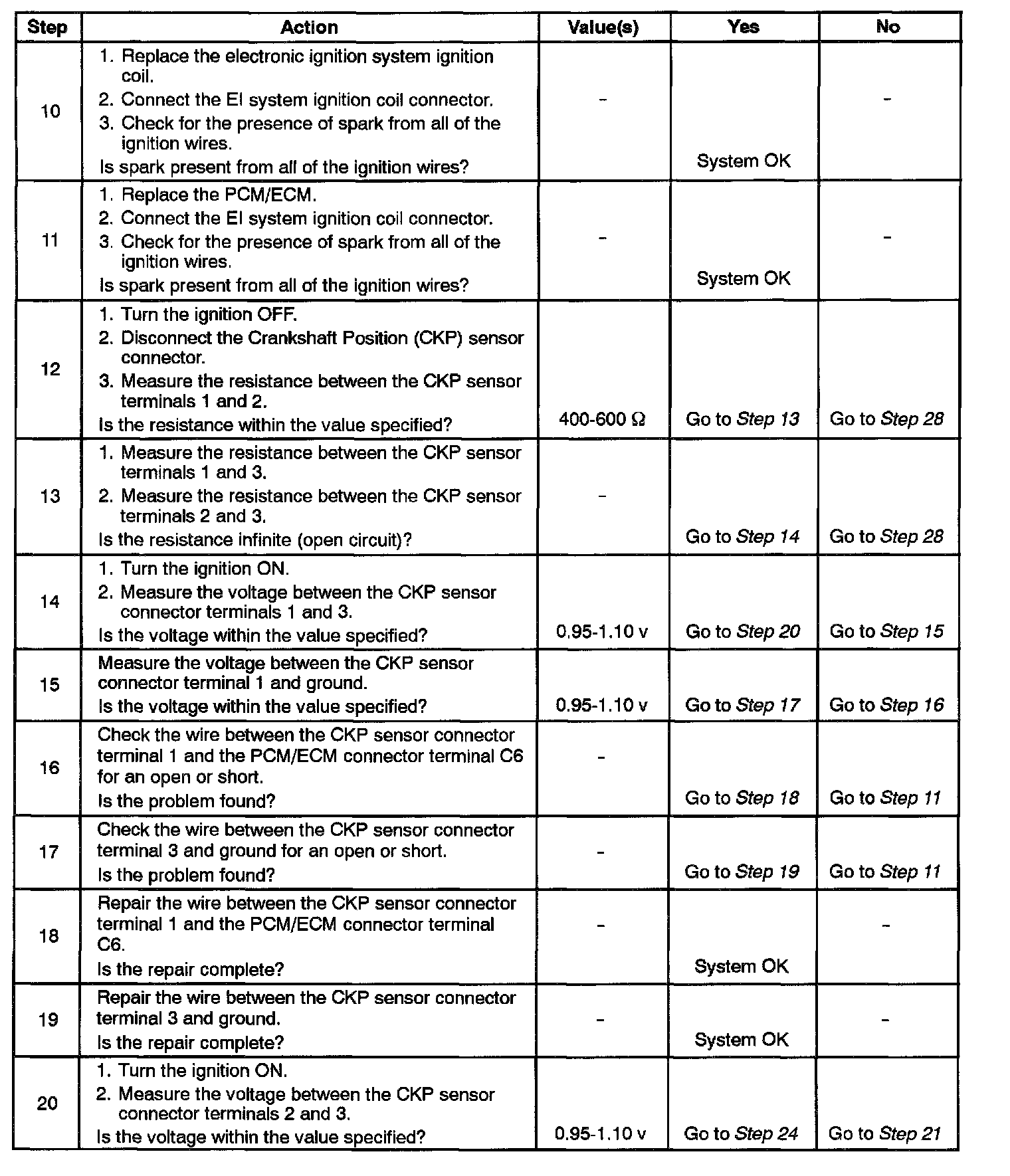 11. After confirming proper CKP sensor inputs to the PCM/ECM and no wiring problems present, it can be determined that the PCM/ECM is at fault.