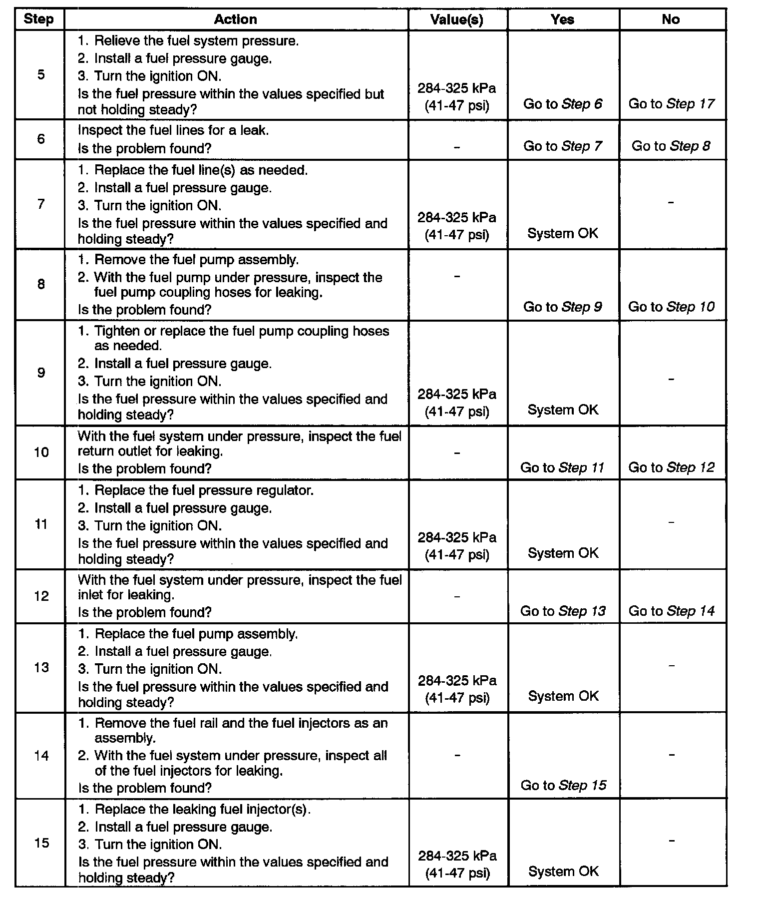 The fuel pump is an in-tank fuel pump mounted to a fuel sender assembly. The fuel pump will remain on as long as the engine is cranking or running and the powertrain control module (PCM)/engine control module (ECM) is receiving reference pulses from the crankshaft position (CKP) sensor. If there are no reference pulses, the PCM/ECM will turn off the fuel pump two seconds after the ignition switch is turned ON or two seconds after the engine stops running. The fuel pump delivers fuel to the fuel rail and the fuel injectors, where the fuel system pressure is controlled from 284 to 325 kPa (41 to 47 psi) by the fuel pressure regulator. The excess fuel is returned to the fuel tank.
