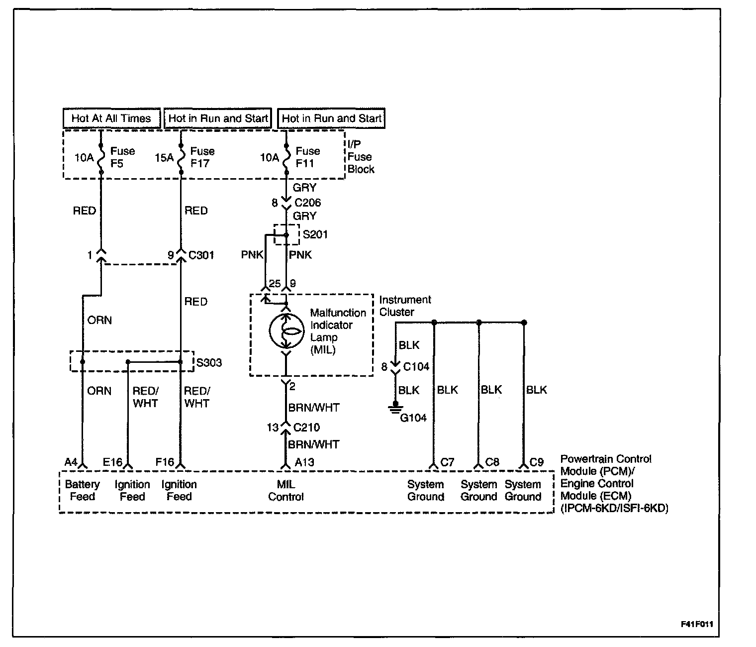 When the ignition is turned ON, the malfunction indicator lamp (MIL) will be turned on and remain on until the engine is running, if no Diagnostic Trouble Codes (DTCs) are stored. Battery voltage is supplied through the ignition switch directly to the MIL telltale. The powertrain control module (PCM)/engine control module (ECM) controls the MIL by providing a ground path through the MIL control circuit to turn ON the MIL.