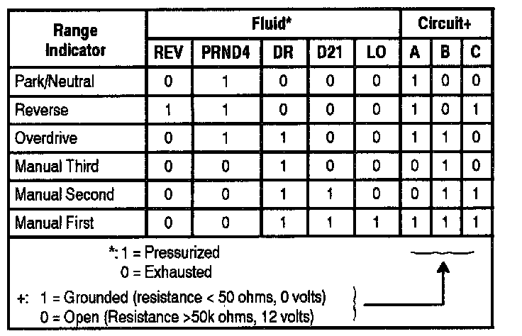 Each fluid pressure switch produces either an open or ground to the PCM depending on the presence of fluid pressure at the switches. The sequence of open and closed switches produces a combination of voltage readings that are monitored by the PCM (see chart and switch logic diagram).