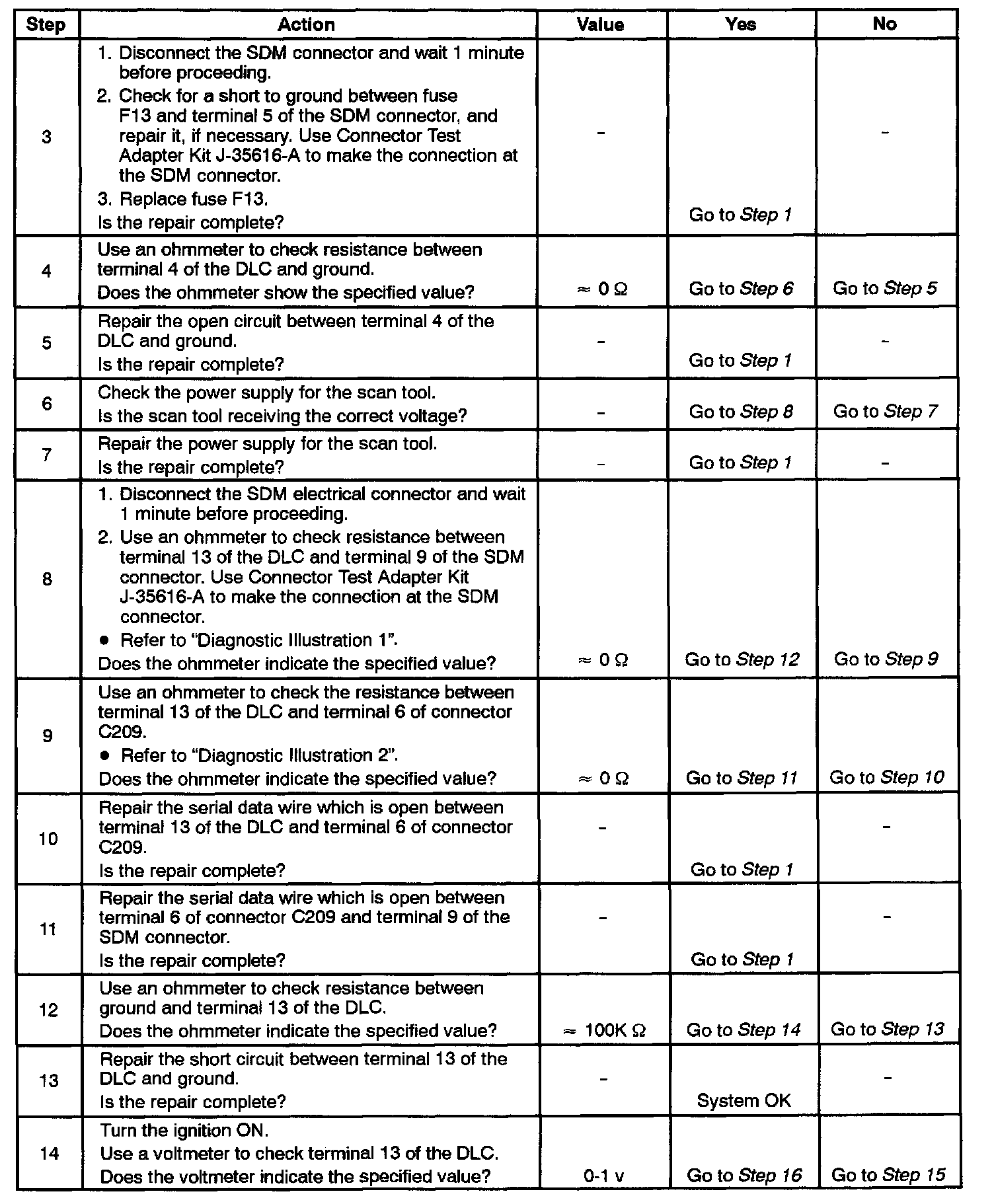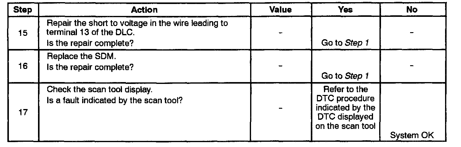 When the ignition switch is turned ON, the Sensing and Diagnostic Module (SDM) is able to send serial data from terminal 9 of the SDM to terminal 13 of the Data Link Connector (DLC).