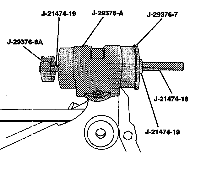1. Place the control arm bushing housing J-29376-A on the rear axle. Slide the puller bolt J-21474-19 through the thrust washer J-1474-19, the control arm bushing plate J-29376-7, the rear control arm bushing, the control arm bushing remover/installer J-29376-6A and into the nut J-21474-18.