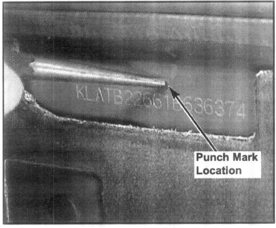 8. Raise the hood and place a punch mark in the bulkhead approximately 1/4 inch above the 10th digit of the VIN ("Y"-2000 OR "1"-2001) in the engine compartment as shown.