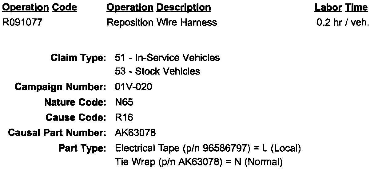 To eliminate the possibility of this occurring, Daewoo is implementing a recall action where Stores/Independent Dealers are to reposition the wire harness and attach it permanently in a location where the wire harness cannot be damaged.