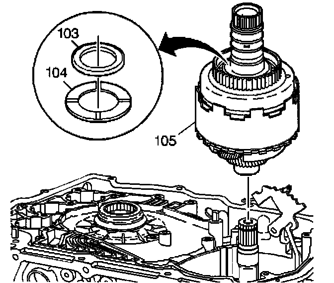DIRECT/COAST CLUTCH AND REACTION GEAR SET REMOVALImportant: Keep the bearing assembly (103) and the selective thrust washer (104) on top of the direct/coast clutch and reaction carrier assembly (105).