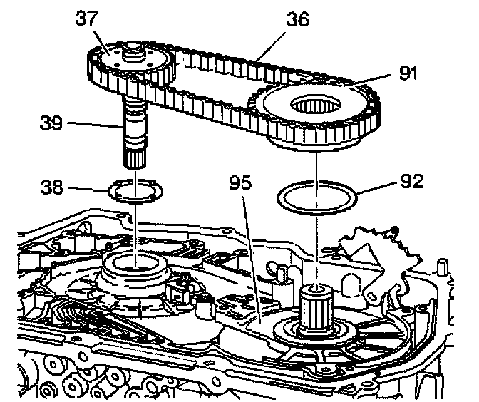 2. If the drive sprocket to drive sprocket support thrust washer (38) has not remained with the drive sprocket assembly (37 and 39), remove the drive sprocket to drive sprocket support thrust washer (38). The driven sprocket to driven sprocket support thrust washer (92) should remain with the driven sprocket support assembly (95).