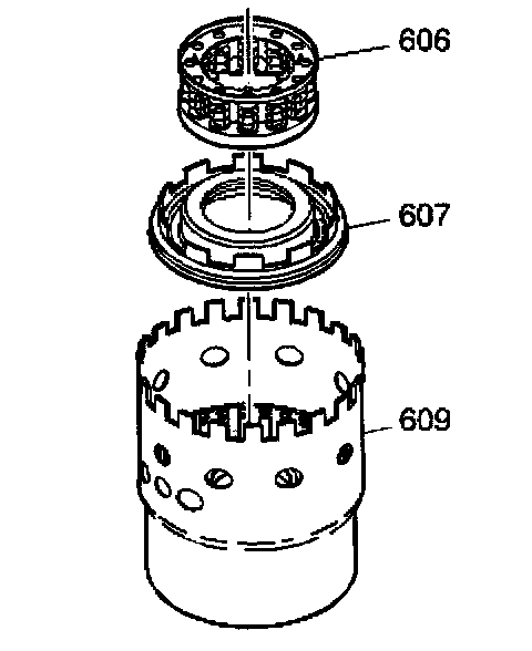 3. With the snap ring tabs facing up, assemble the forward clutch return spring assembly (606) into the forward clutch housing (609).