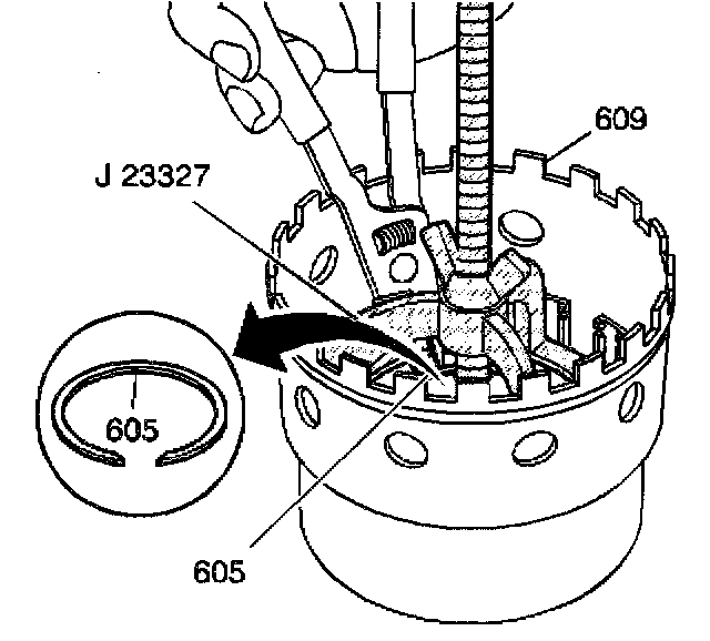 5. Assemble the snap ring (605) in order to retain the forward clutch return spring.