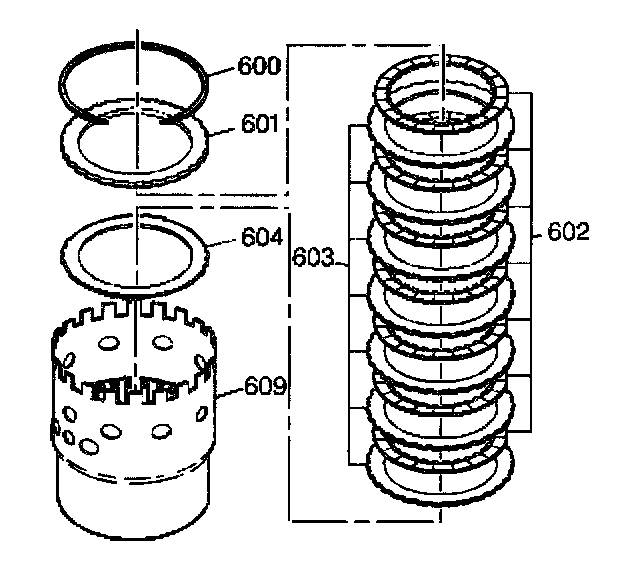8. Install the seven steel plates (603) and the seven new fiber plates (602) in alternating order beginning with a steel plate (603).