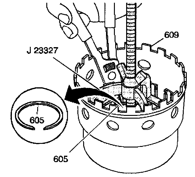 7. Remove the return spring snap ring (605).