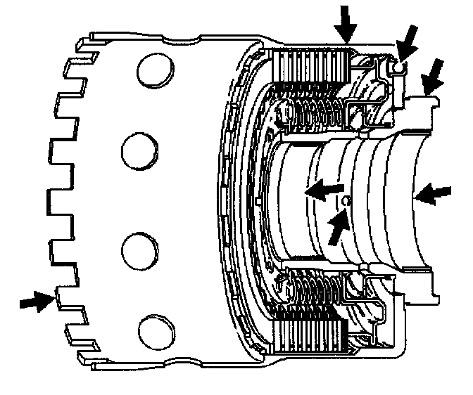 14. Inspect the housing, the plates, the bushings, the splines, the band apply surface, the roller clutch race, and the spring assembly.