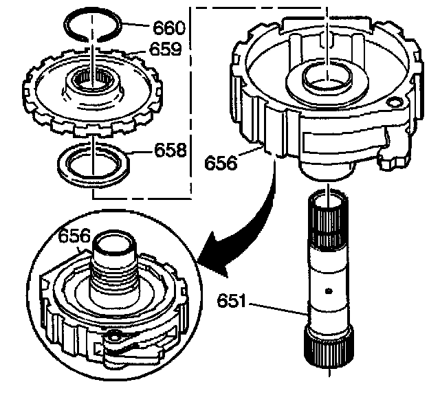 6. Remove the forward clutch support (656) from the final drive sun gear shaft (651).