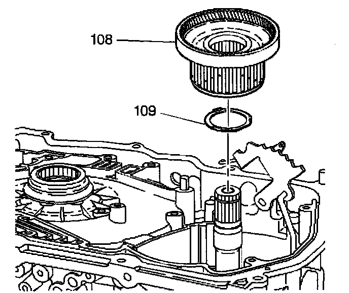 2. If the forward clutch hub to race thrust washer (109) did not remain with the forward clutch hub, remove the forward clutch hub to race thrust washer (109).