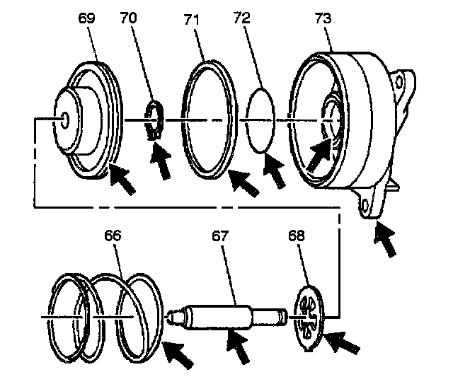 4. Assemble the servo piston assembly (67-70) into the servo cover (73). Lubricate the piston seals with transmission fluid in order to aid in assembly.