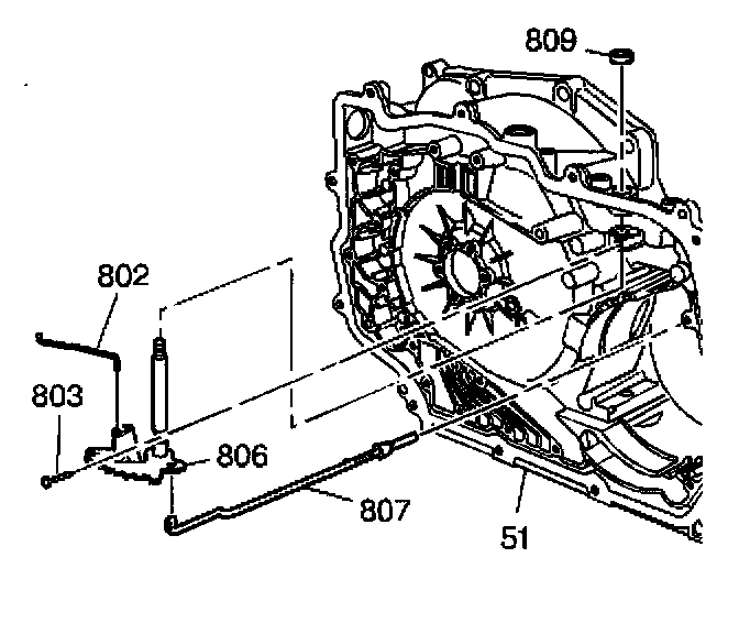 2. With the manual valve to detent lever link (802) and the parking lock actuator assembly (807) attached, install the manual shaft and detent lever assembly (806) into the case.