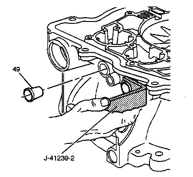 1. Use a hammer in order to wedge the J 41239-2 into the transmission cooler line seal (49) on the outside of the case bore.