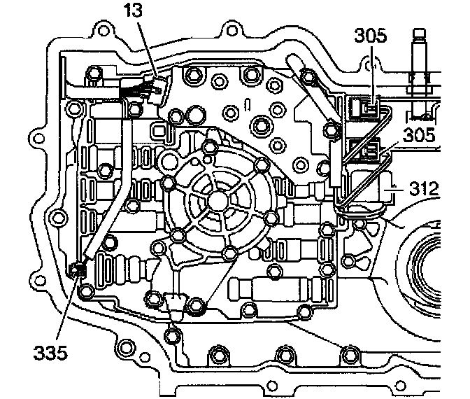 4. Disconnect the wiring harness connectors from the TCC solenoid (335).