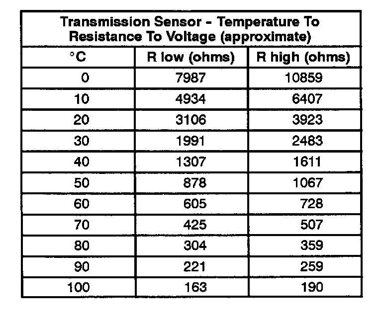 The internal electrical resistance of the sensor varies in relation to the operating temperature of the transmission fluid (see chart).