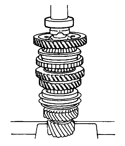 3. Remove the first gear, the flat-type first-gear needle bearing, and the mainshaft wear plate.