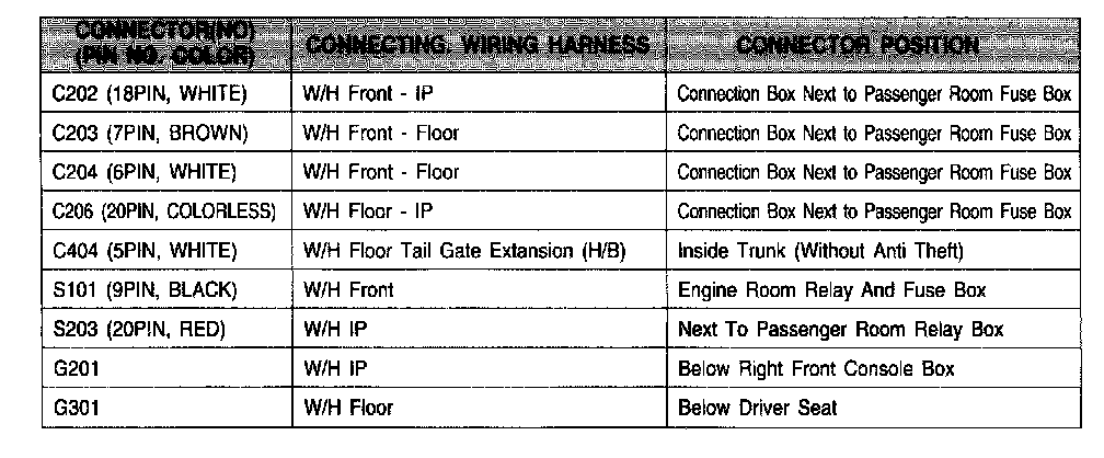 Connector Information Chart: