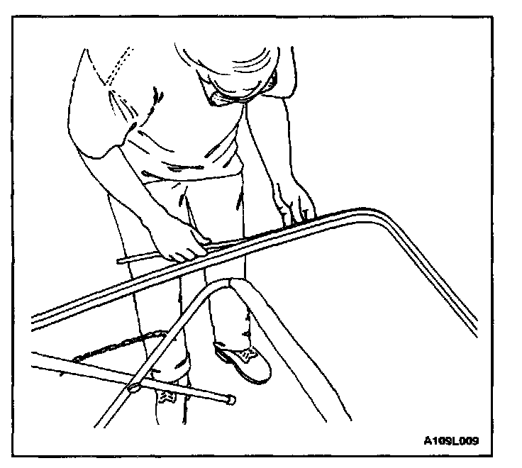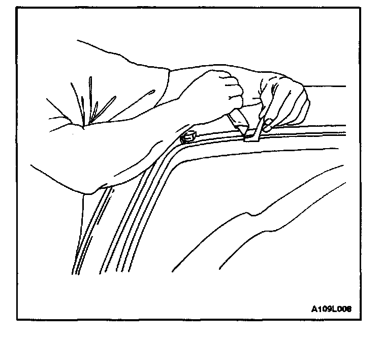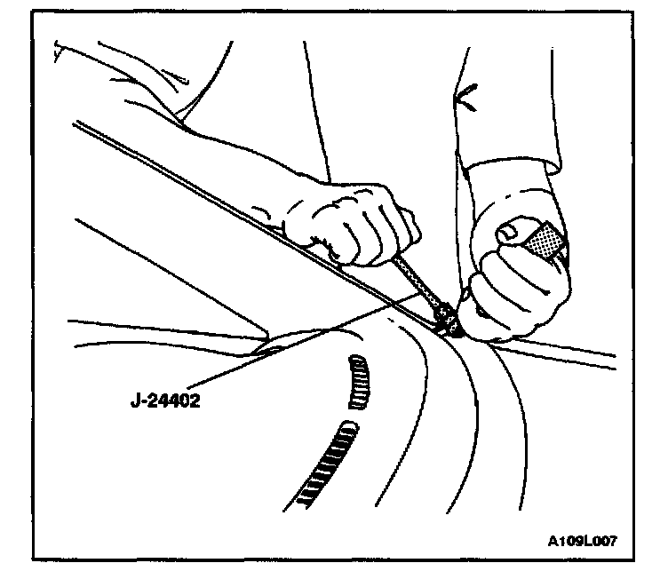 4. Using the glass sealant remover J-24402, cut the adhesive around the windshield.
