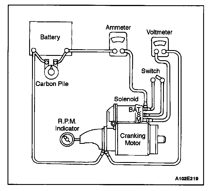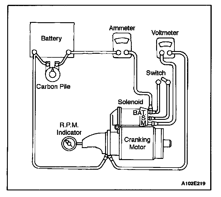 8. To begin the no-load test, close the switch and compare the rpm, the current, and the voltage readings with the specifications. Refer to "Starter Specifications". Make disconnections only with the switch open. Use the test results as follows:
